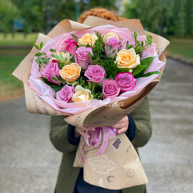 15 пышных роз в крафте