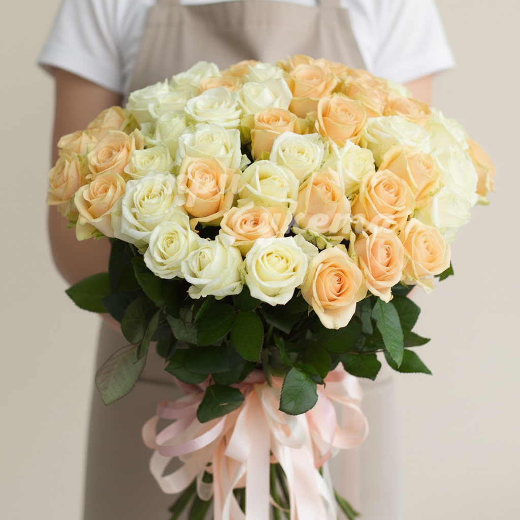 Букет из 51 белой и персиковой розы