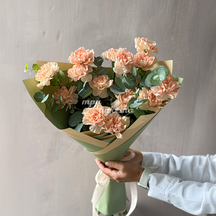 Букет из персиковых гвоздик и эвкалипта