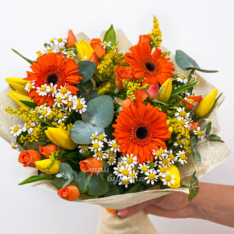Букет оранжевых гербер с желтыми тюльпанами