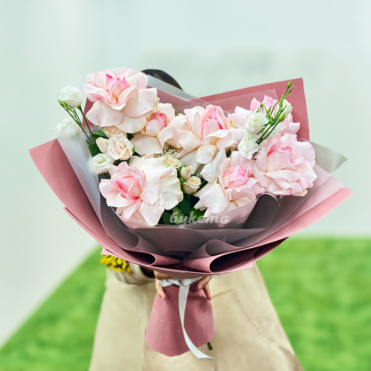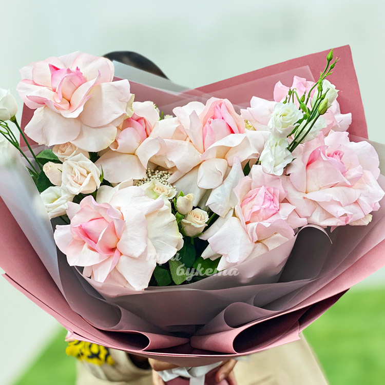 Букет розовых французских роз и эустом