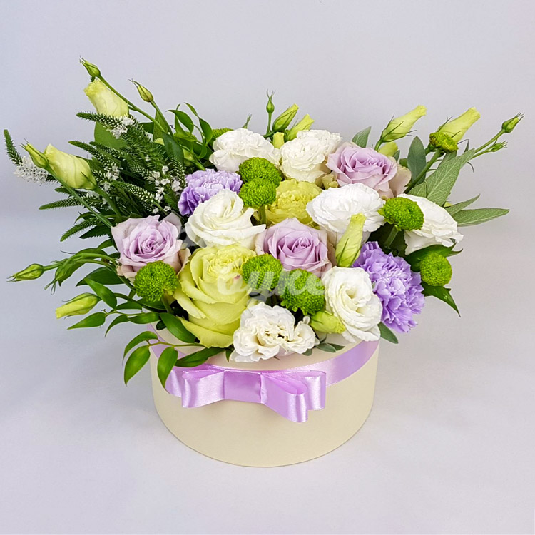Эустомы, гвоздики и розы в коробке