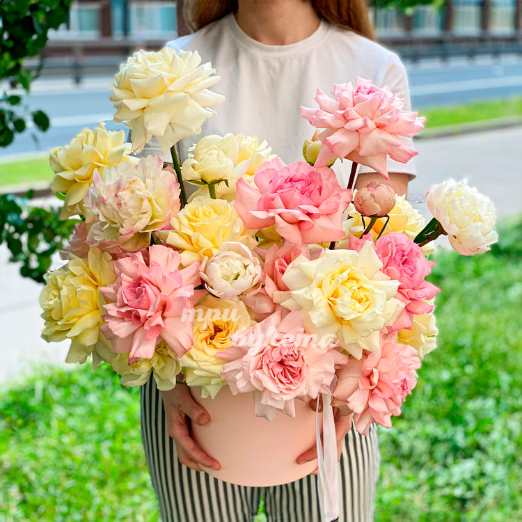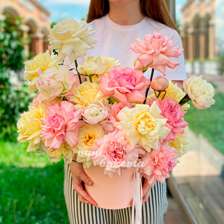 Коробка кремовых и розовых роз и пионов