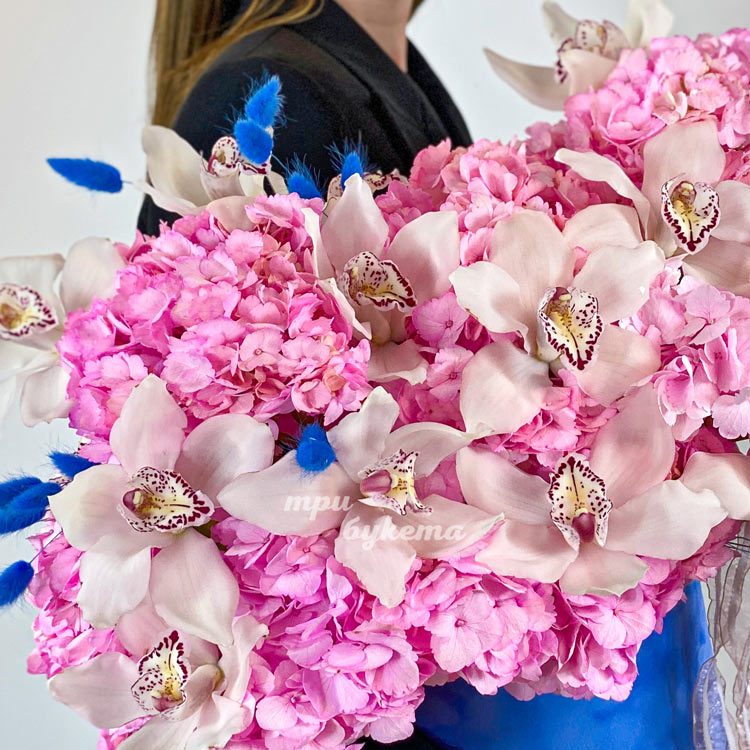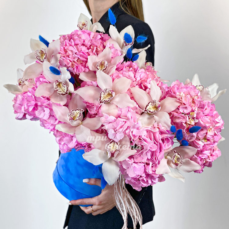Коробка розовых гортензий и белых орхидей