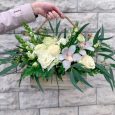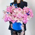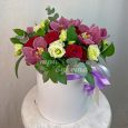 Коробка розовых орхидей с эустомами