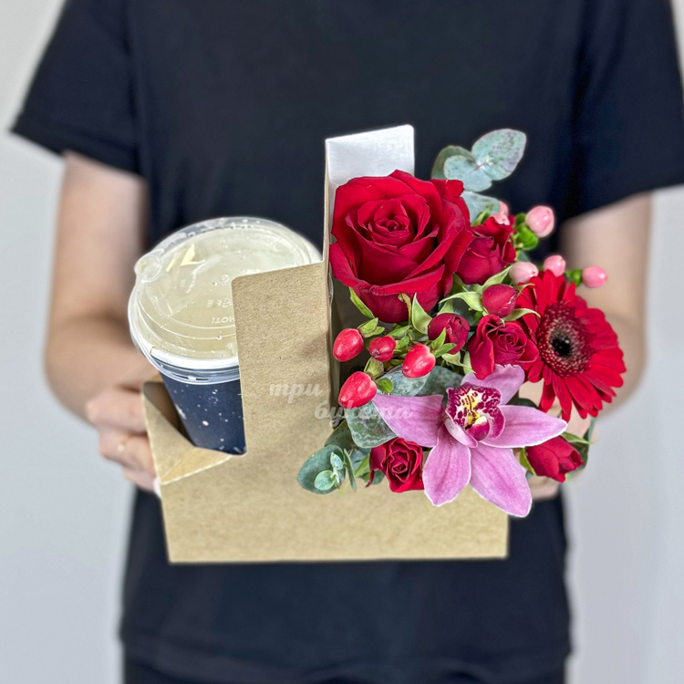 Коробочка с кофе, розами и орхидеей