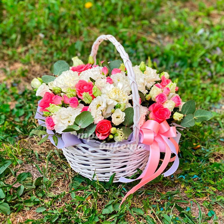 Корзина белых эустом и розовых роз