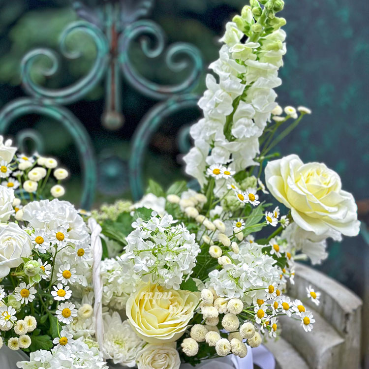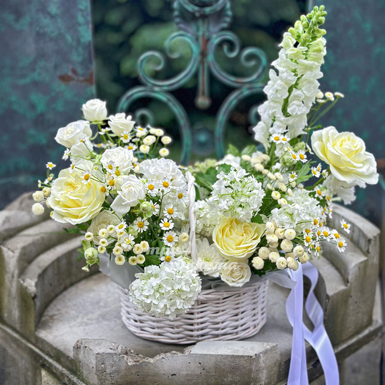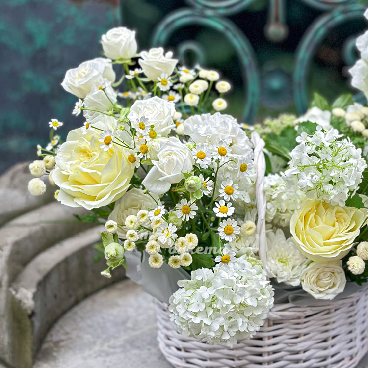 Корзина белых ромашек, хризантем и роз