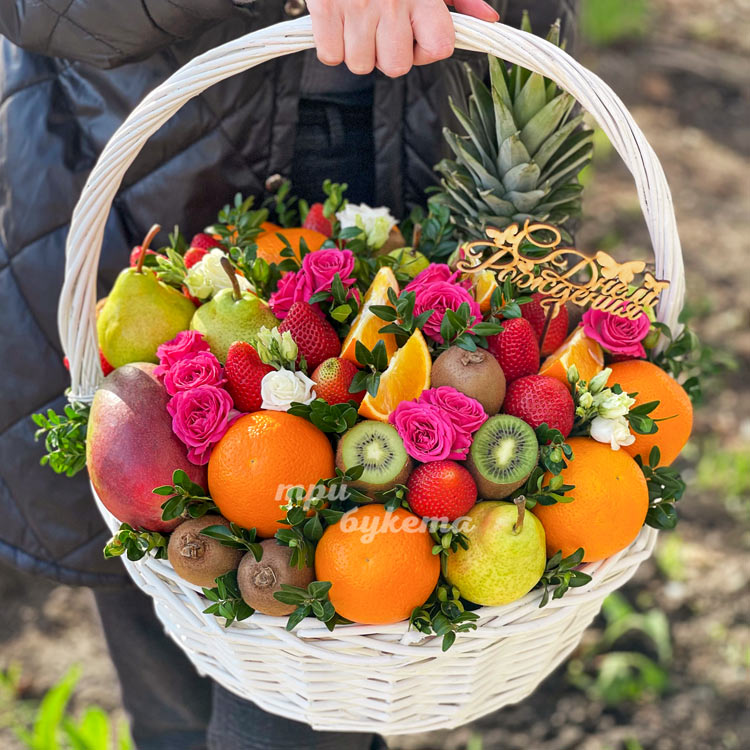 Корзина фруктов и роз на день рождения