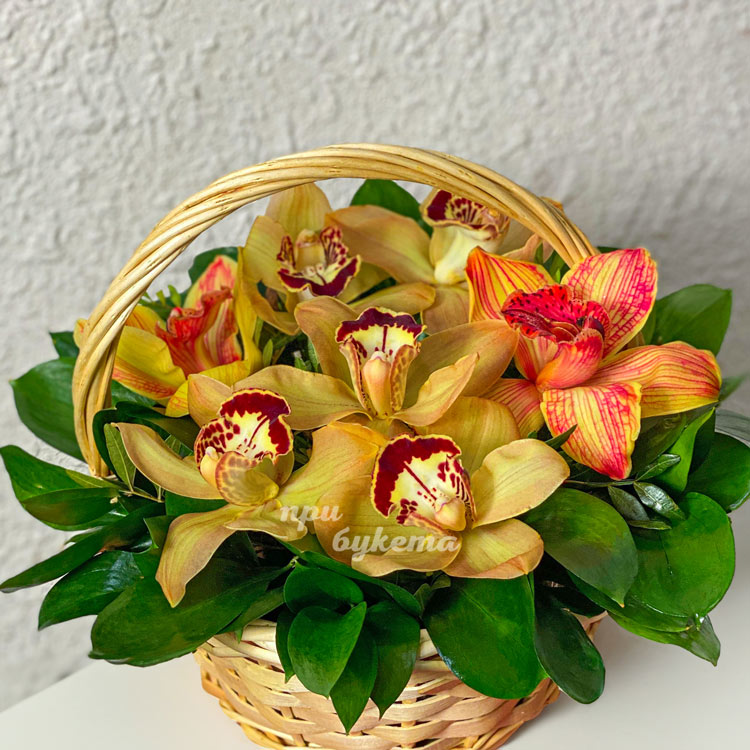 Корзина желтых орхидей с рускусом