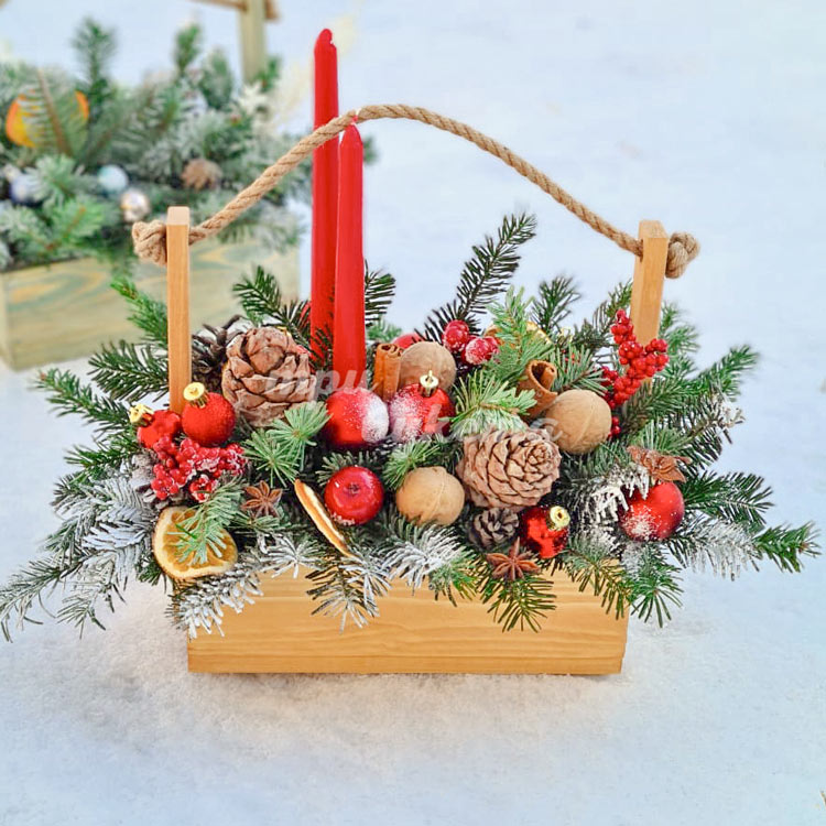 Новогодний ящик с шарами и свечами