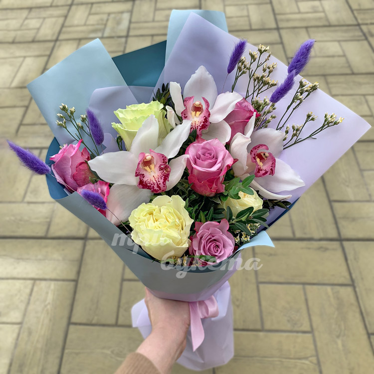 Орхидеи с розами и лагурусом