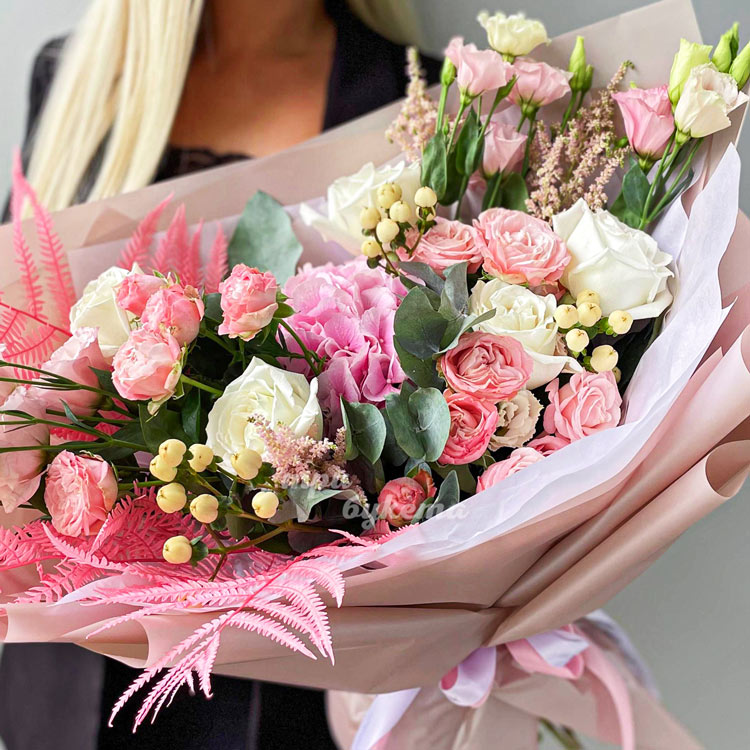 Пышный букет роз с гортензией на 1 сентября