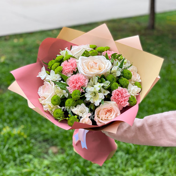 Розовые гвоздики и белые розы