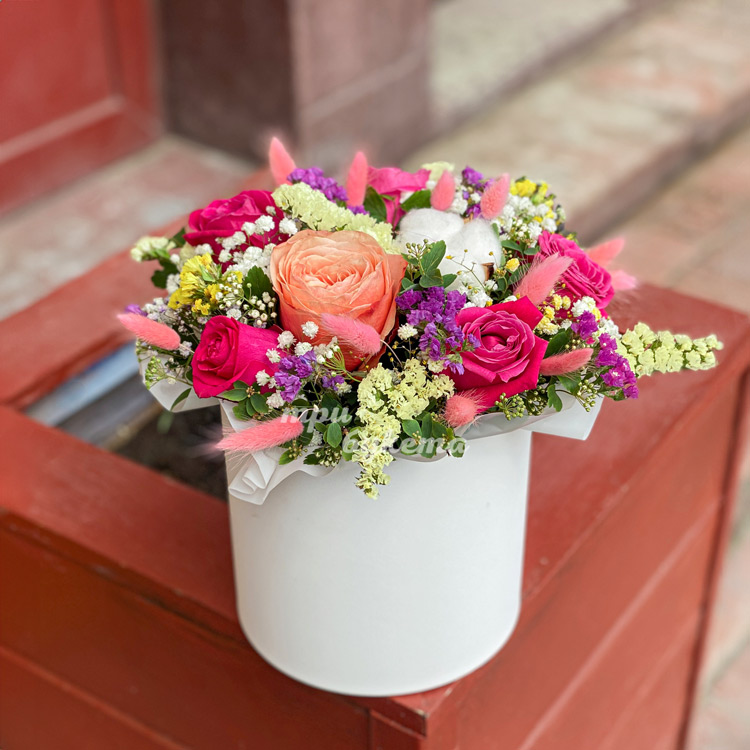 Яркая коробка с розами и статицей