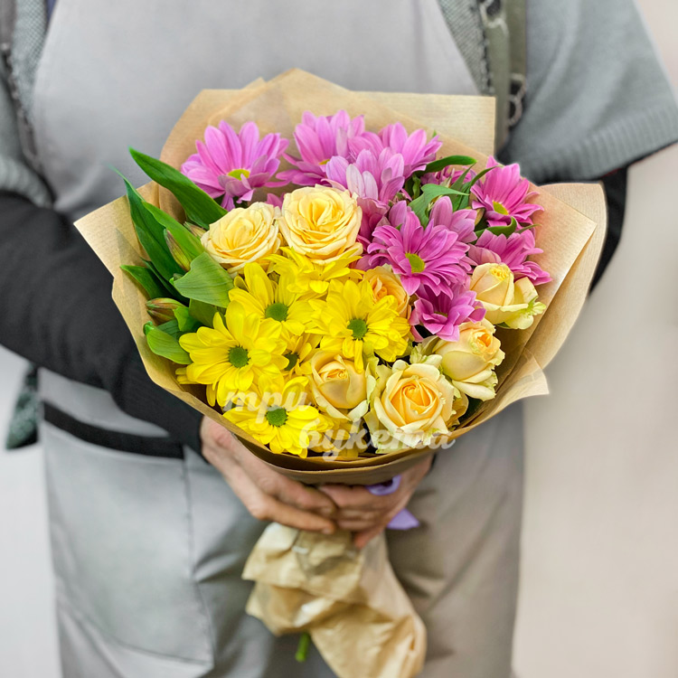 Желтые розы и розовые хризантемы